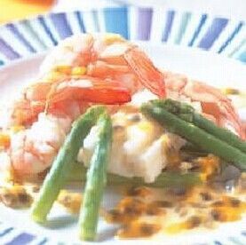 山藥100克,鮮蝦3只,蘆筍5根,醬汁:少許,百香果1顆