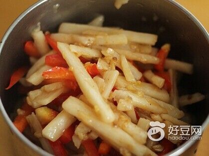 5.待山藥八分熟時(shí)加入紅椒絲,再加入少許鹽和味精